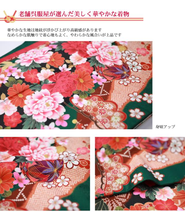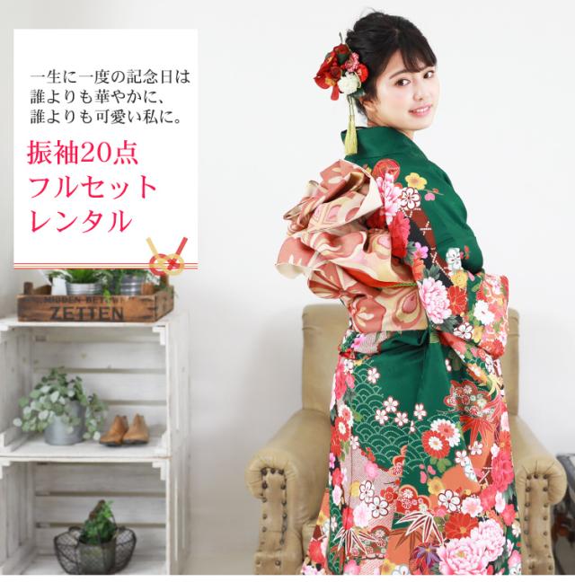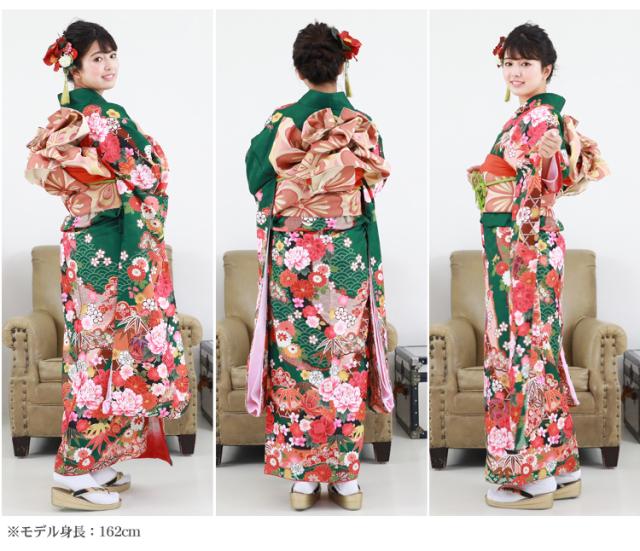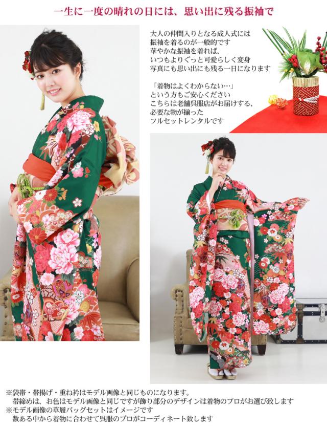 最大20日間レンタル 成人式 振袖 レンタル 20点フルセット 派手 「緑地に雲取りと鞠と牡丹」 成人式 結婚式 フォーマル 絵羽柄