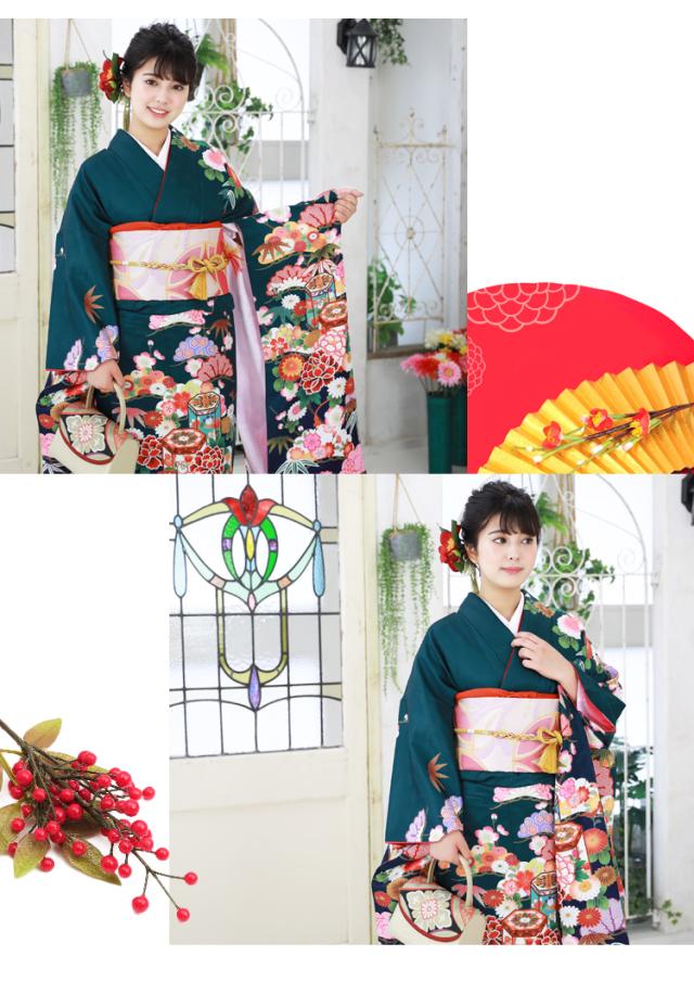 最大20日間レンタル 成人式 振袖 レンタル 20点フルセット 派手 「深緑地に牡丹・菊・松」 成人式 結婚式 フォーマル 絵羽柄
