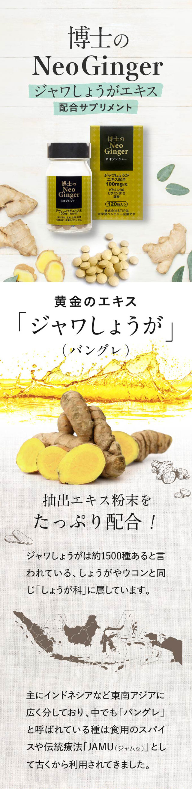 | 特徴 | 「博士のネオジンジャー」は、ジャワしょうがバングレ(バングレ)を主成分とした食品です。 インドネシアで古くから使われていたバングレは、しょうが科しょうが属に属していますが、ジンゲロールやショウガオールは含まれず、クルクミンを含有するなどの特徴があります。しょうが科には、49属1500種が存在していると言われていますが、バングレは日本の研究者によって、その主成分が明らかとなったものです。 また、自然農法により栽培されているバングレは成長に時間がかかり、大変貴重なものとされています。なお、製品は、GMP適合認定を受けている工場で生産したものです。 |