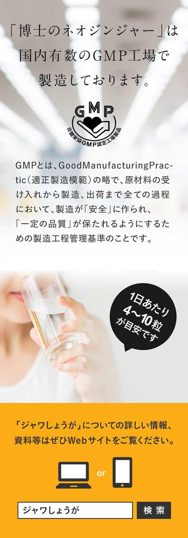 | 原材料名 | ジャワしょうがエキス粉末(デキストリン、ジャワしょうがエキス)(国内製造)、澱粉、寒天/増粘多糖類、乳酸Ca、ショ糖エステル、ステアリン酸Ca、二酸化ケイ素、ビタミンB6、葉酸、ビタミンB12 |
