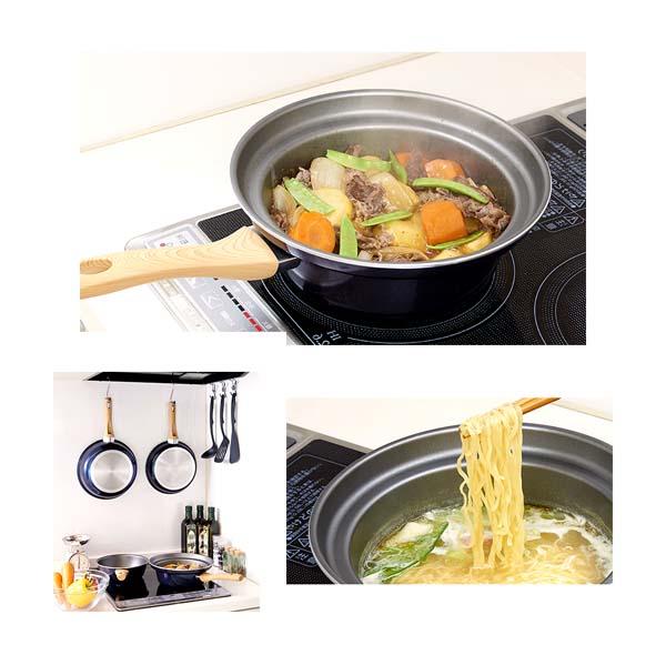 「炒める」「焼く」「煮る」「ゆでる」「炊く」1つで5役!お料理の幅が広がるマルチな鍋型フライパン。段フチで吹きこぼれしにくいので、ラーメンや煮物料理にも。焦げ付きにくいからお手入れ楽々。手になじむ木目調のフィットグリップ。内面2層、外面2層の多層コート!内面は人工ダイヤモンド配合のふっ素樹脂コートで耐磨耗性が高く、外面はセラミックコートで汚れが落としやすい! | |