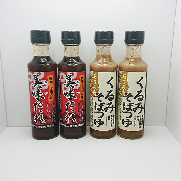 あずみ庵くるみそばつゆ2本+信州上田名物美味だれ2本(信州長野県のお土産 おみやげ 蕎麦つゆ 胡桃 お土産 通販)