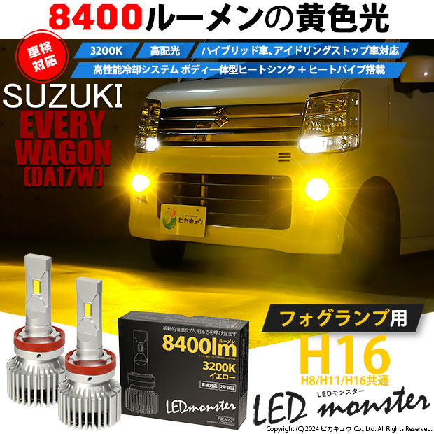ピカキュウ,LED専門店ピカキュウ,ピカキュウledフォグ,フォグランプ,ハロゲンフォグランプ,前部霧灯,黄色,H8対応,H11対応,H16対応,L8400,LED MONSTER,LEDモンスター,8400lm,イエロー,スズキ,エブリィワゴン,SUZUKI,EVERY WAGON,DA17W