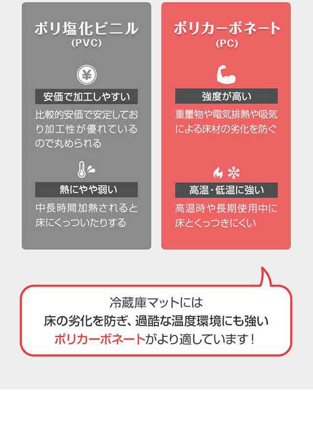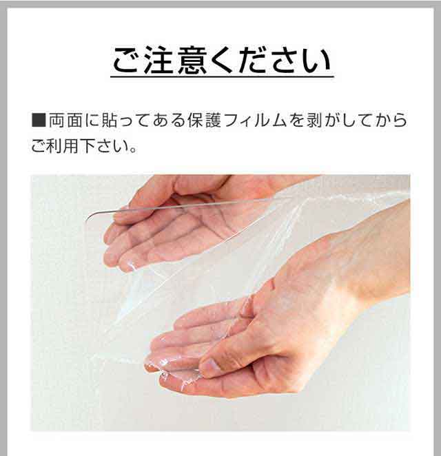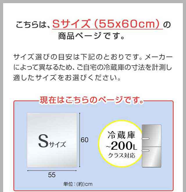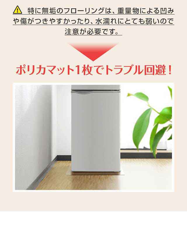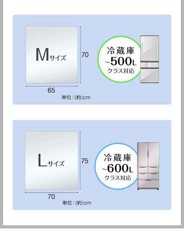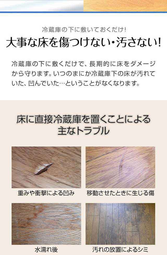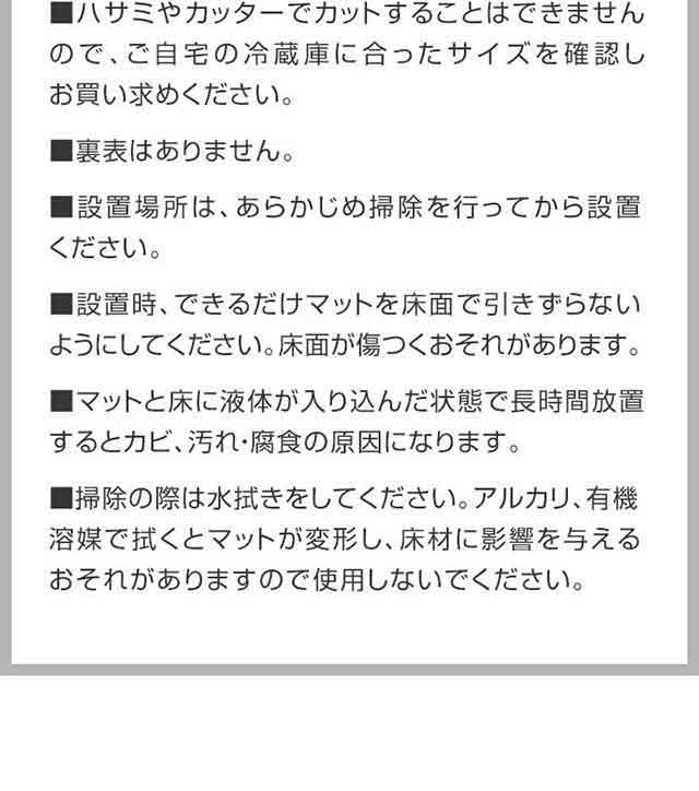 | 特記事項: ・ハサミやカッターでカットすることはできませんのでご自宅の冷蔵庫に合ったサイズを確認し、お買い求めください。 ・裏表はありません。 ・設置場所は、あらかじめ掃除を行ってから設置ください。 ・設置時、できるだけマットを床面で引きずらないようにしてください。床面が傷つくおそれがあります。 ・マットと床に液体が入り込んだ状態で長時間放置するとカビ、汚れ・腐食の原因になります。 ・掃除の際は水拭きをしてください。アルカリ、有機溶媒で拭くとマットが変形し、床材に影響を与えるおそれがありますので使用しないでください。 |