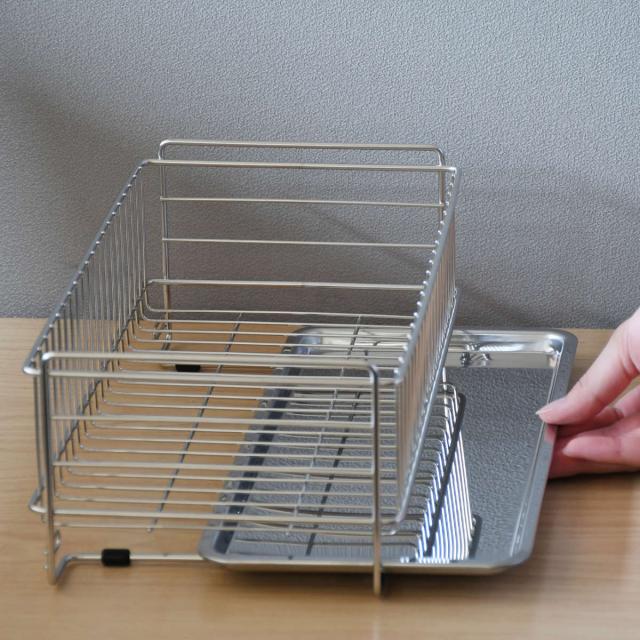水受けはステンレス製のトレーが付いています。食器をおいたままでもトレーは引き出すことができるので、水が溜まってしまった時も安心です。ラックの奥にトレー用のストッパーが付いているので、トレーが奥から滑り落ちる心配もありません。