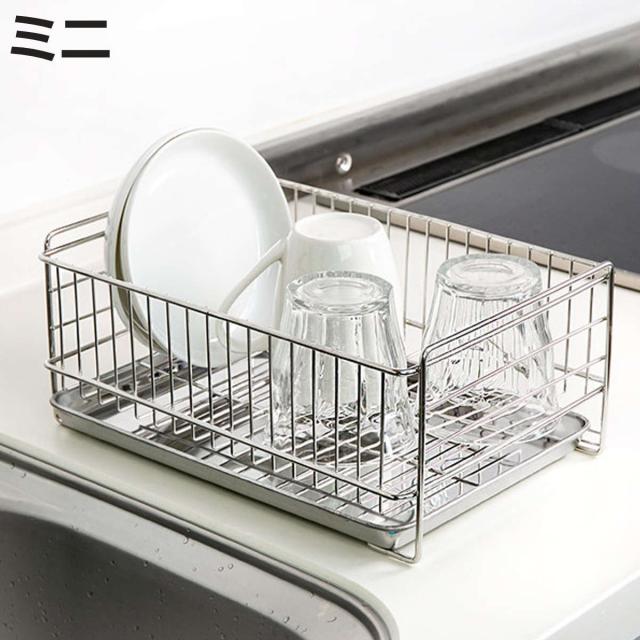 水切りラック ミニ どこでも置けるトレー付き ステンレス製 アットアクア ( 水切りかご 水切りカゴ 水切りバスケット 水切りトレー ステンレス ディッシュラック シンク上 シンクサイド 水切り 洗い物 食器洗い 乾燥 )