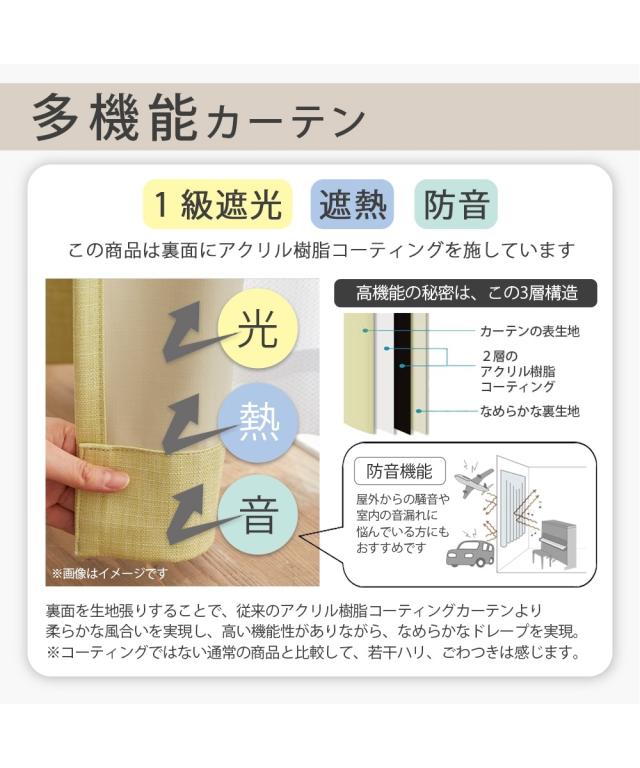 <カーテン>●品質:ポリエステル100%(裏面=アクリル樹脂コーティング/ポリエステル100%) ●遮光率=1級遮光(99.99%)