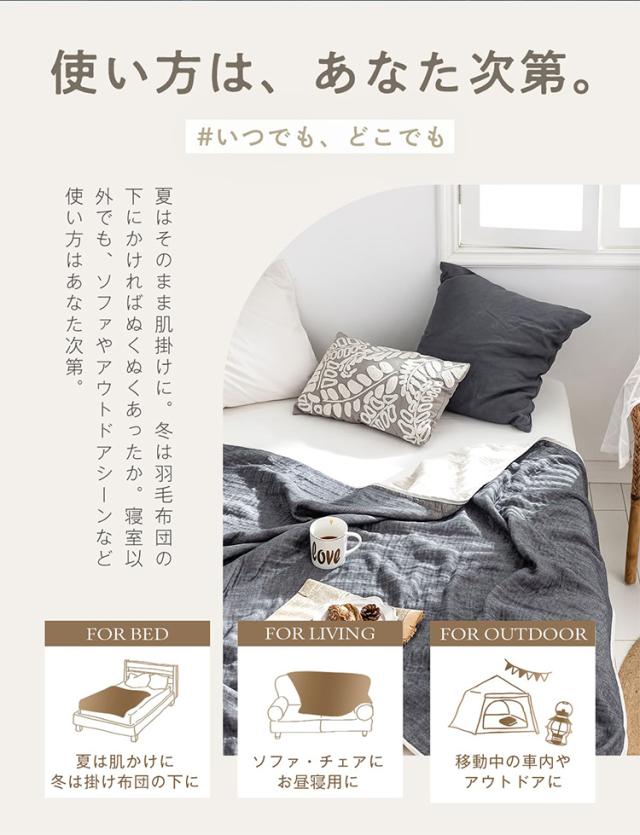 ガーゼが空気をたっぷりと含み、適切な温度を保つので、夏はもちろん年間を通してお使いいただけます。