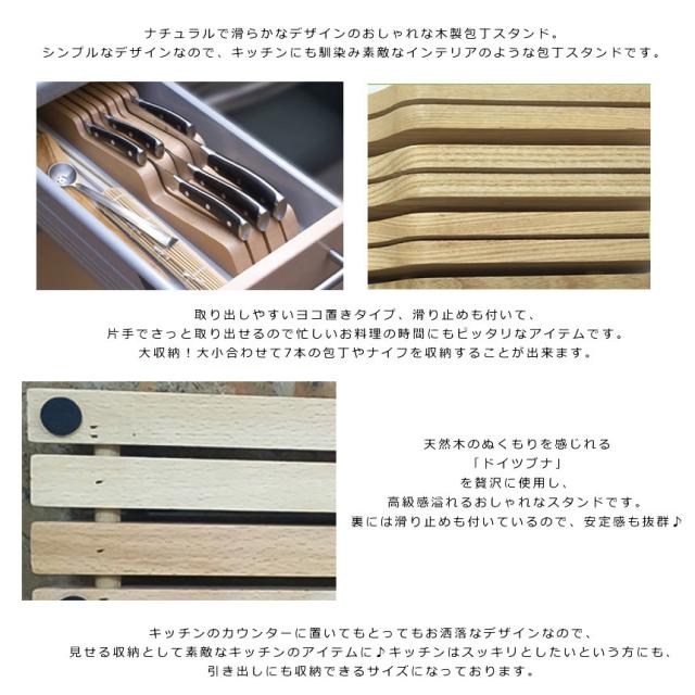- 注文してすぐの対応ありがとうございました。 引越し先使用のため感想おそくなりました キッチン棚扉にも包丁立てあったのですが 引き出しの中には入れるもの欲しくて初めてでしたが しっかりした素材でいろんなサイズに適応していて 入れやすい取りやすいで助かります。 長く愛用させていただきます
