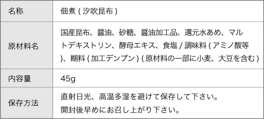 【原材料名】国産昆布、醤油、砂糖、醤油加工品、還元水あめ、マルトデキストリン、 酵母エキス、食塩/調味料(アミノ酸等)、糊料(加工デンプン) (原材料の一部に小麦、大 豆を含む)