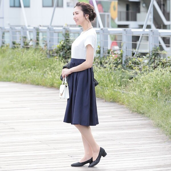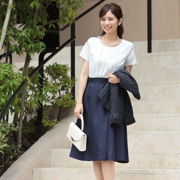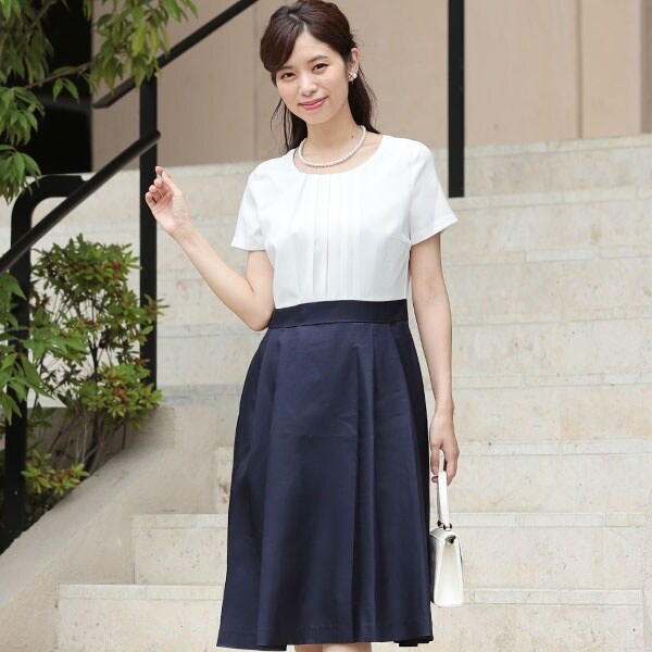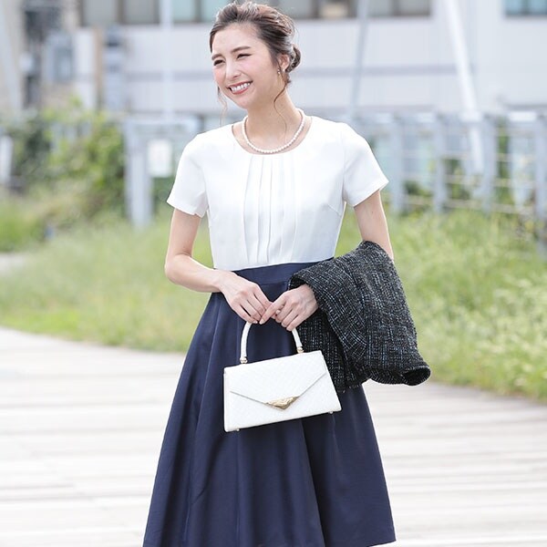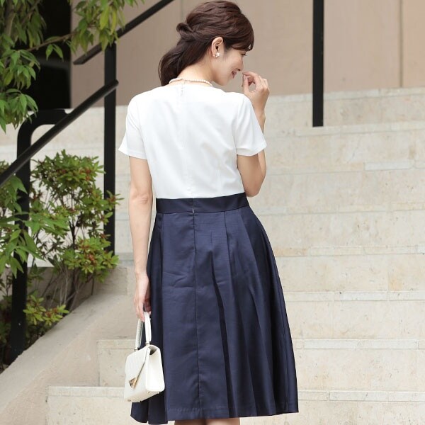 ハイウエスト切り替えのワンピースは脚長効果があり、上品なアイテム。