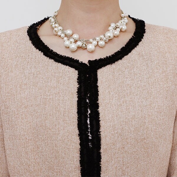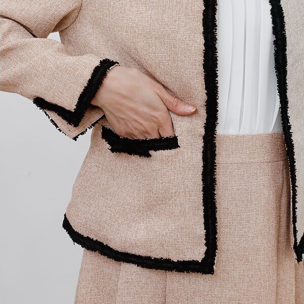 ツイード生地のノーカラージャケットには高級感ある先染め素材使用。