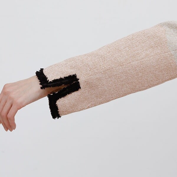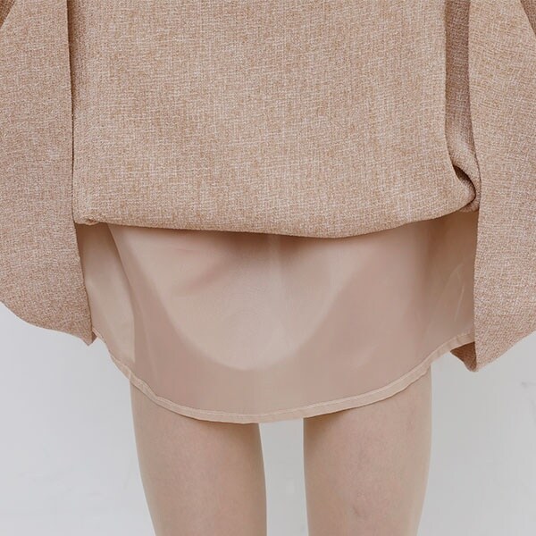 先染め素材が風合いの美しいミックスツイード生地を使用したジャケット。ワンピースのスカート部分は光沢感ある上品で華のある生地感になっています。