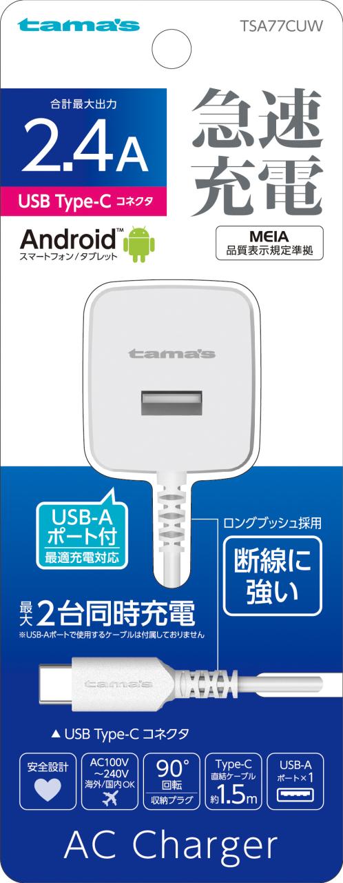 多摩電子 TSA77CUW Type-C コンセントチャージャー 2.4A ケーブル直結型 Aポート付(ホワイト)[TSA77CUW] 返品種別A