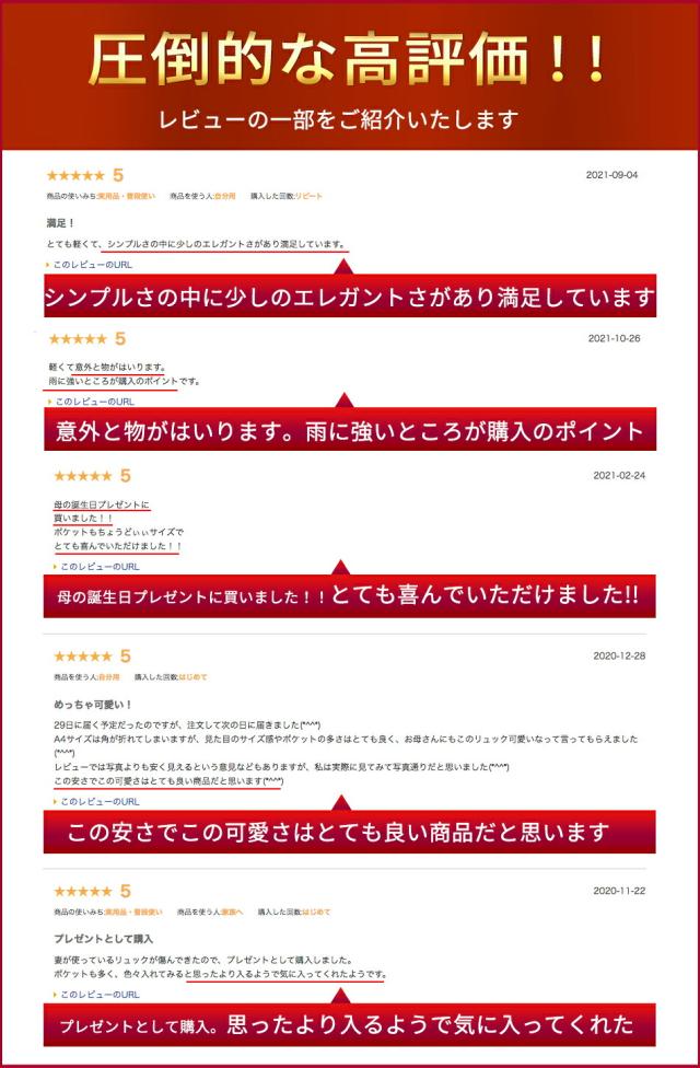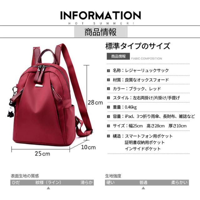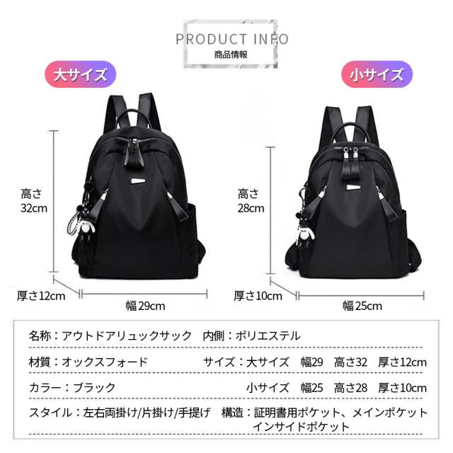 - ブラック(大)を買いました。思っていた以上に大きめで、1泊旅行なら使えると思います。背中側にポケットも防犯対策にもなり使い勝手の良いリュックだと思いました。サイドポケットに、細い水筒がはいるのでそれも...