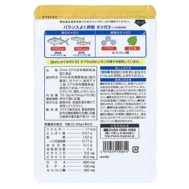 ●【弊社の商品が選ばれる理由】(1)魚と植物の栄養素をバランスよく配合 (2)魚油の戻り臭を抑えるため、カプセル内にレモン香料を使用 (3)5粒でオメガ3 770mg 配合( DHA 480mg + EPA 130mg + α-リノレン酸 160mg )