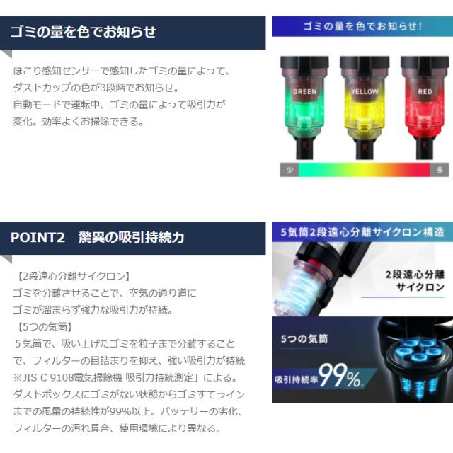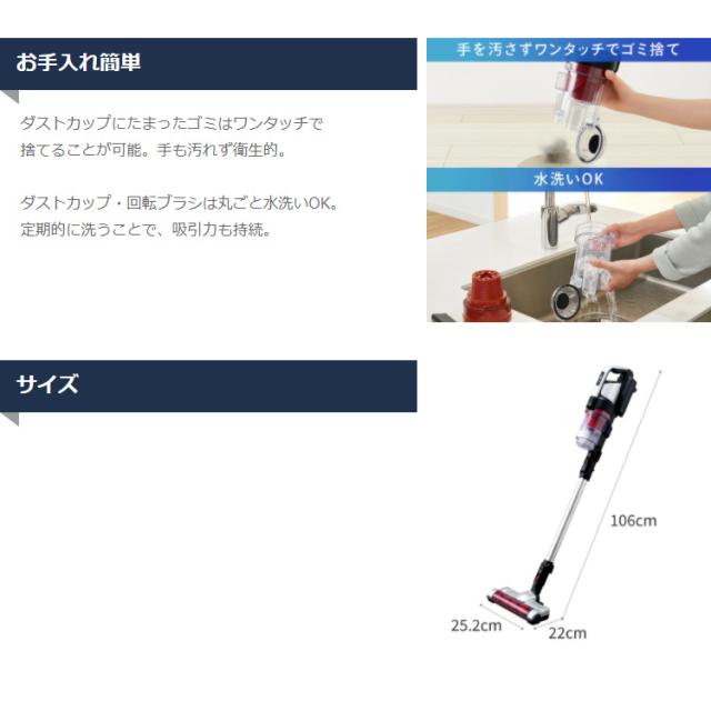 - 吸い込みもよく、少し起動しただけでホコリがとれるとれる! 目に見えないホコリがこんなにあるのかとびっくりします。 ヘッドが少し安っぽく、左右に動かすとギギギと音が鳴ります。 そして電池切れるのが少し早いかなあと。 ただコードレスすごく使いやすいです。 お値段も手頃で満足です。