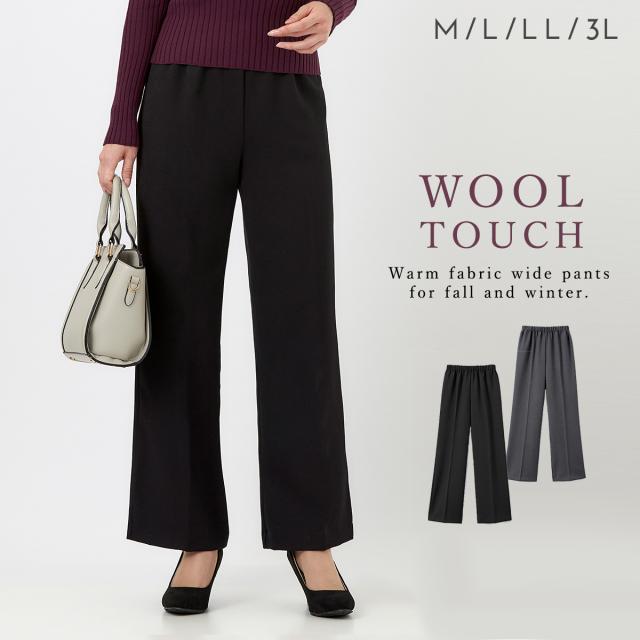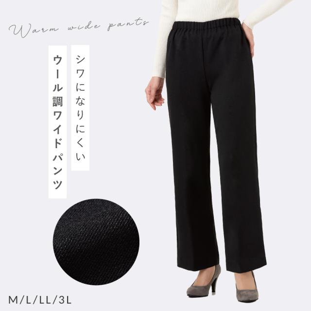 パンツ レディース 冬 ズボン ボトムス 秋冬 秋 あったか ウエストゴム ワイドシルエット 体型カバー 股上深め ハイウエスト シワになりにくい 女性用 M L LL 3L 大きいサイズ ゆったり 無地 おしゃれ かわいい 大人 ブラック 黒 グレー ウール調ワイドパンツ