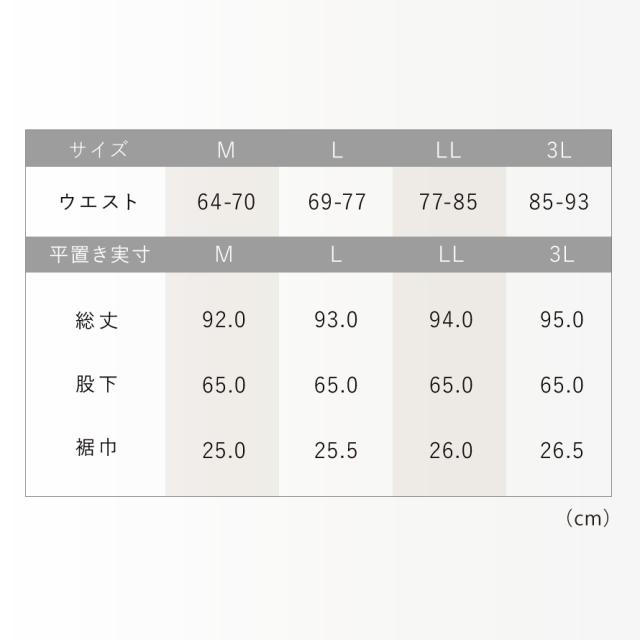 ■サイズ:M/ウエスト64-70、総丈92、股下65、裾幅25、L/ウエスト69-77、総丈93、股下65、裾幅25.5、LL/ウエスト77-85、総丈94、股下65、裾幅26、3L/ウエスト85-93、総丈95、股下65、裾幅26.5cm