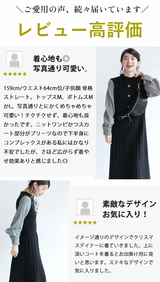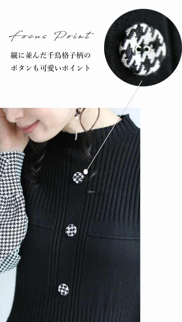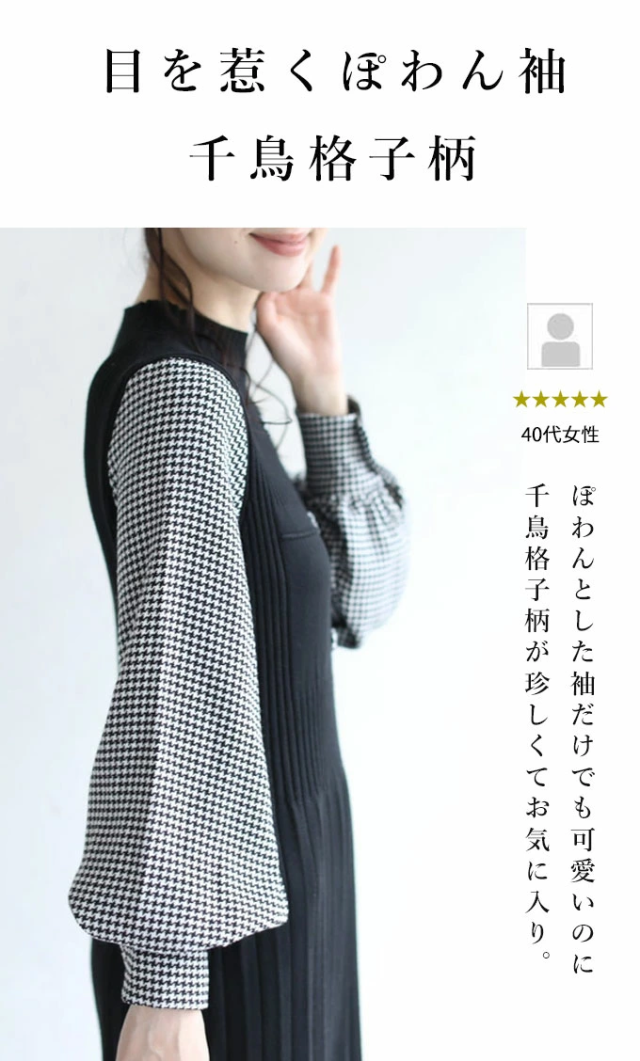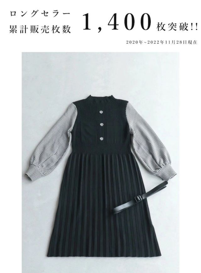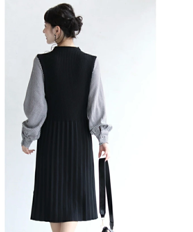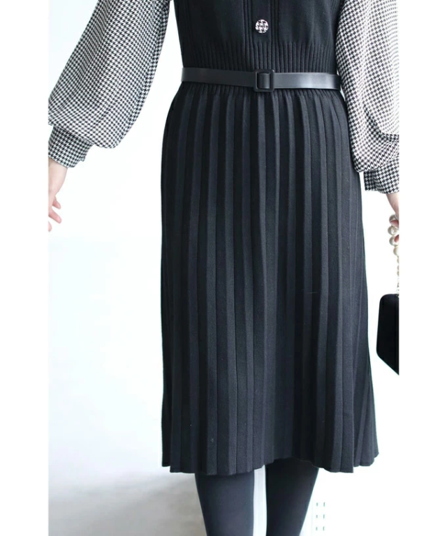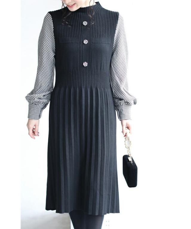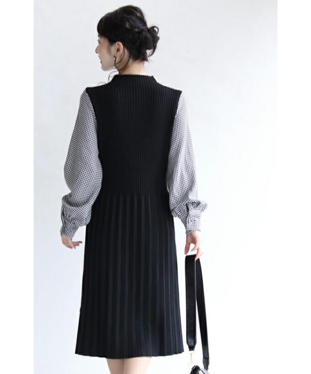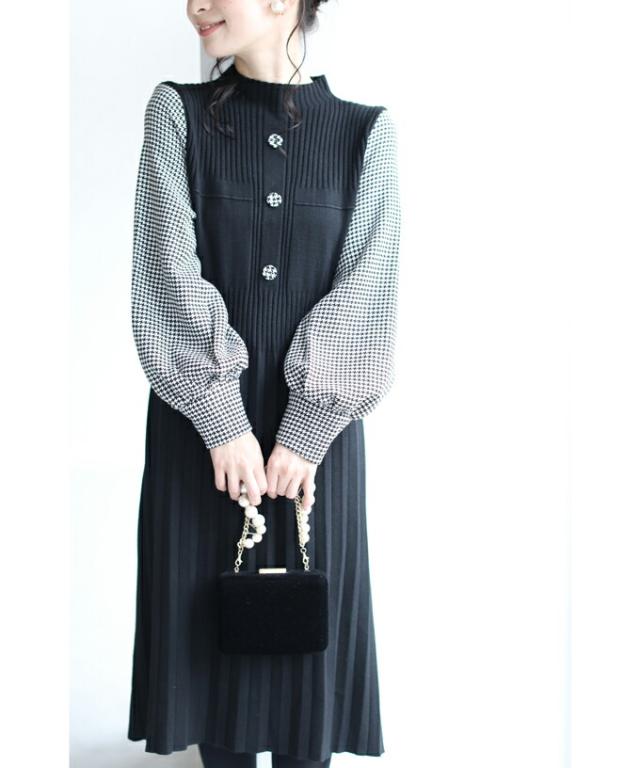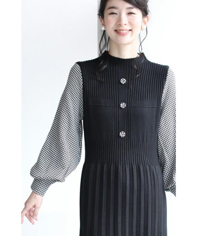 女性らしい千鳥柄スリーブのニットプリーツワンピースです。