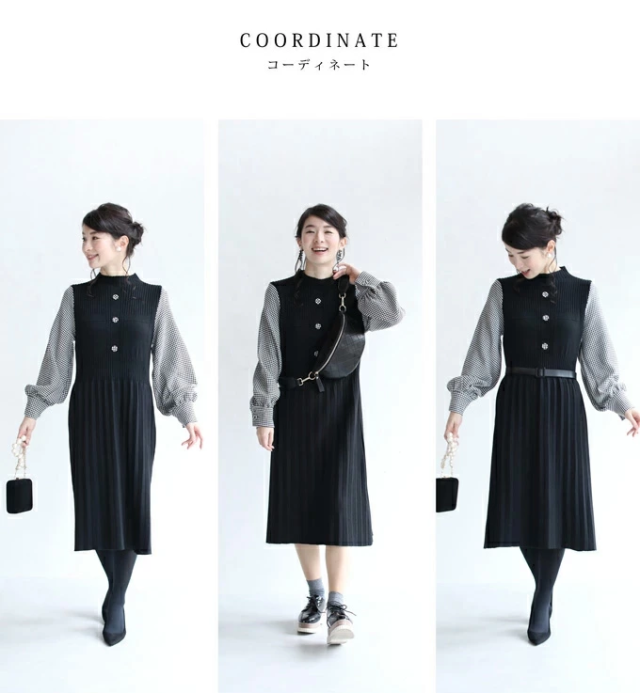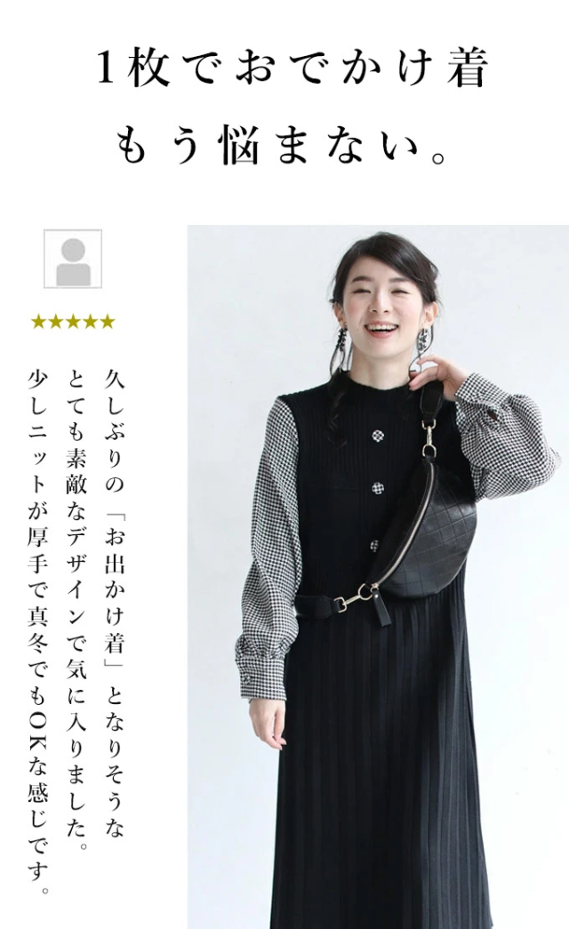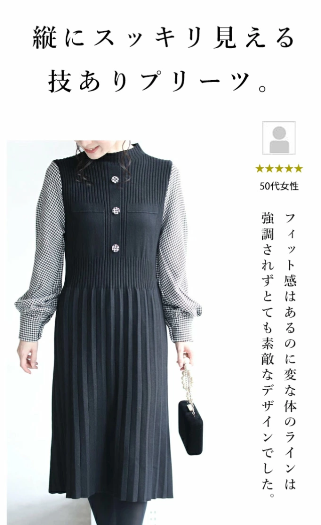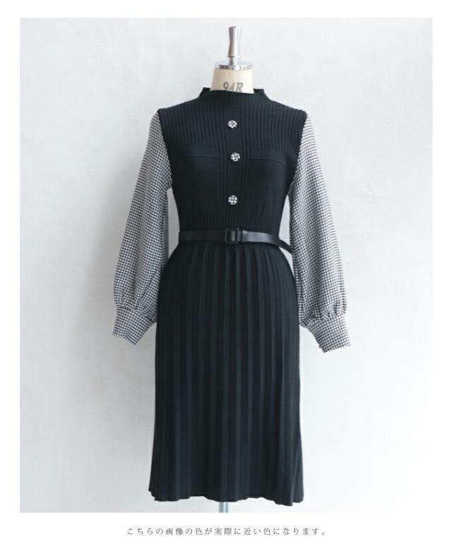 再入荷11月15日 プリーツ ワンピース 膝下丈 ボリューム袖 ベルト付き w69228 S~L ブラック 千鳥格子 袖のプリーツ ニット ミニワンピース cawaii オールインワン きれいめ 卒業 入学 フォーマル フェミニン 重ね着風 お呼ばれ チェック 千鳥柄 ミセス 40代 50代