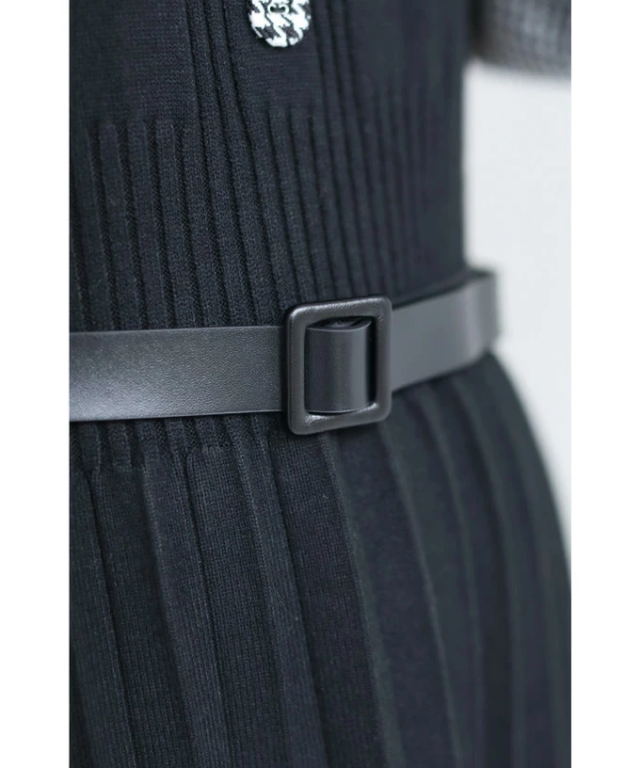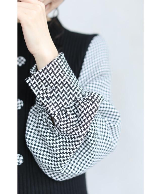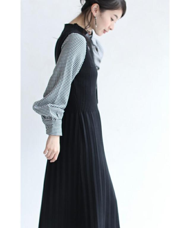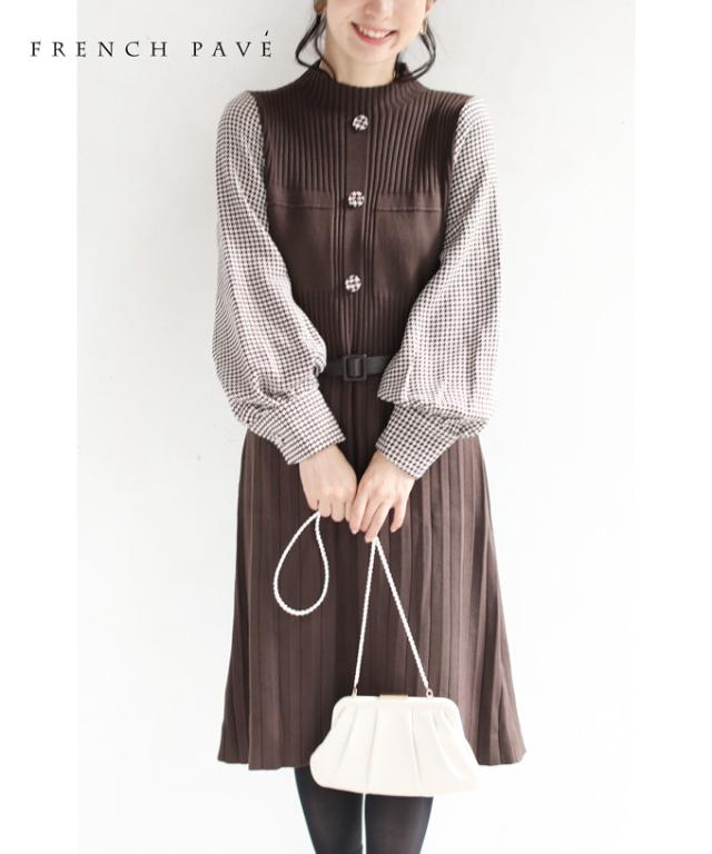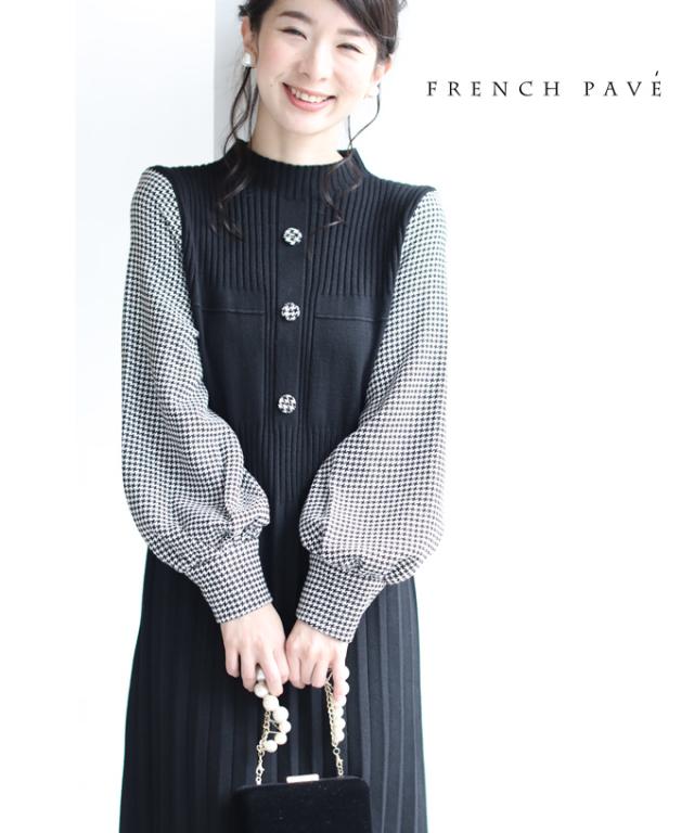 【FRENCH PAVE】「 千鳥格子袖のプリーツニットミニワンピース」