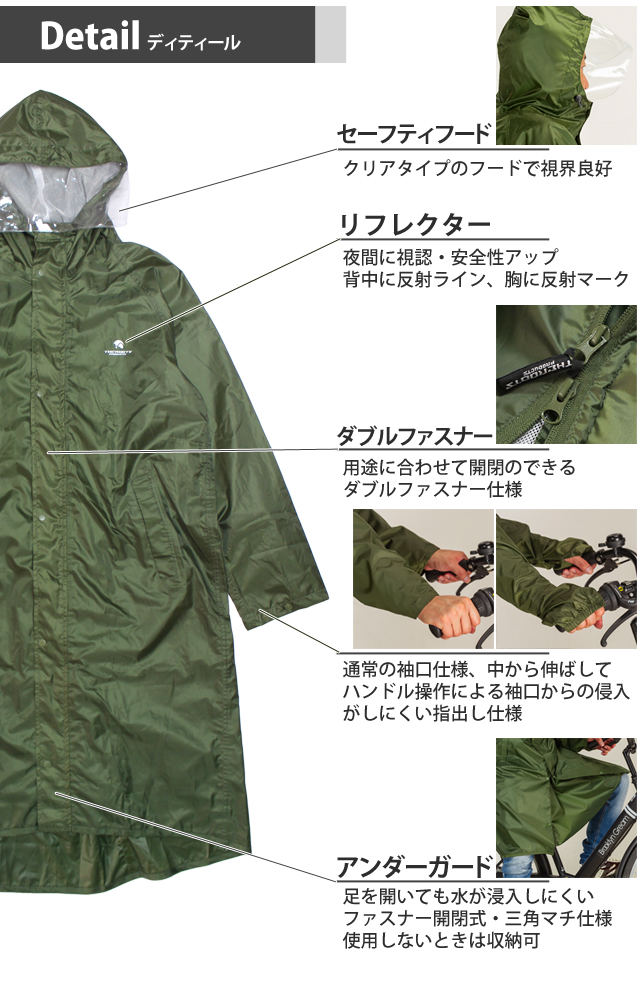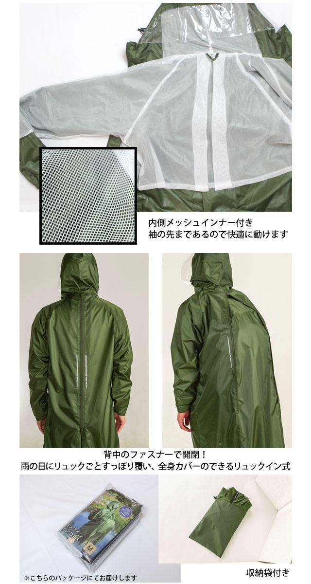 | 商品説明 | 対象:メンズ レディース 大人 兼用 タイプ:レインコート レインウェア 雨合羽 カッパ THEROOTS リュック対応 自転車 サイズ:S M L S〜L 色:カーキ 緑 グリーン オリーブ 用途:アウトドア/職人さん/作業員/自転車/スポーツ観戦/キャンプ 耐水圧 10000mmH2O 透湿度 3000g/m2/24hr ・クリアタイプのフードで視界良好 ・胸と背中にリフレクタープリント ・ダブルファスナー仕様 ・2way袖口 ゴム袖指穴付きタイプに切替可 ・背中ファスナー開閉でリュックに対応 ・足を開いても水が浸入しにくいファスナー開閉アンダーガード付き ・収納袋付き 繊維部分は裏側より目止めテープを張ることで水ぬれを防ぐシームテープ加工 内側は袖先までマイクロメッシュ仕様で快適 |