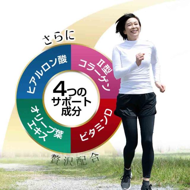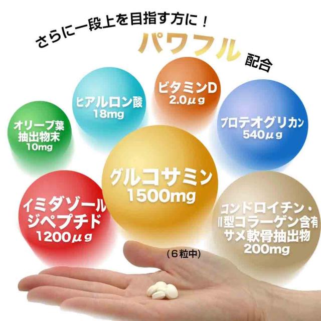 (6粒あたり) グルコサミン 1500mg、コンドロイチン・2型コラーゲン含有サメ軟骨抽出物 200mg、ヒアルロン酸 18mg、イミダゾールジペプチド 1200μg、プロテオグリカン 540μg、オリーブ葉抽出物末 10mg、ビタミンD 2.0μg