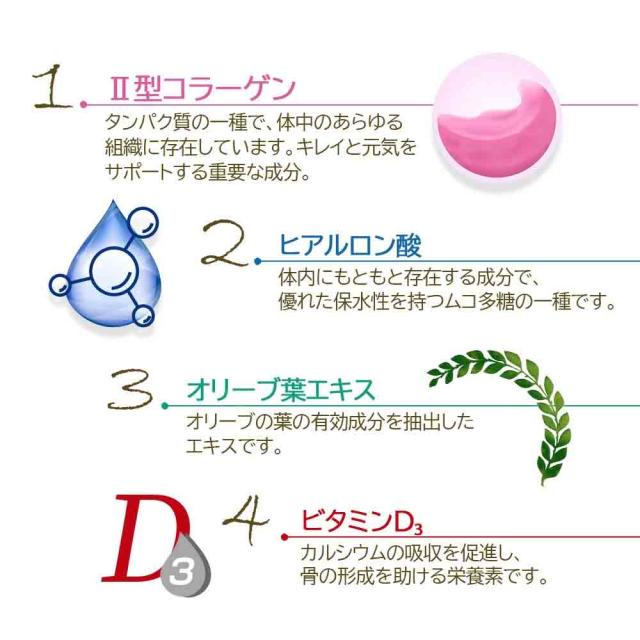 原材料 還元麦芽糖水飴(国内製造)、コンドロイチン・?型コラーゲン含有サメ軟骨抽出物、ヒアルロン酸、オリーブ葉抽出物末、イミダゾールジペプチド含有鶏肉抽出物末、プロテオグリカン含有サケ鼻軟骨抽出物末/グルコサミン(えび・かに由来)、HPC、微粒酸化ケイ素、ステアリン酸Ca、光沢剤、V.D3
