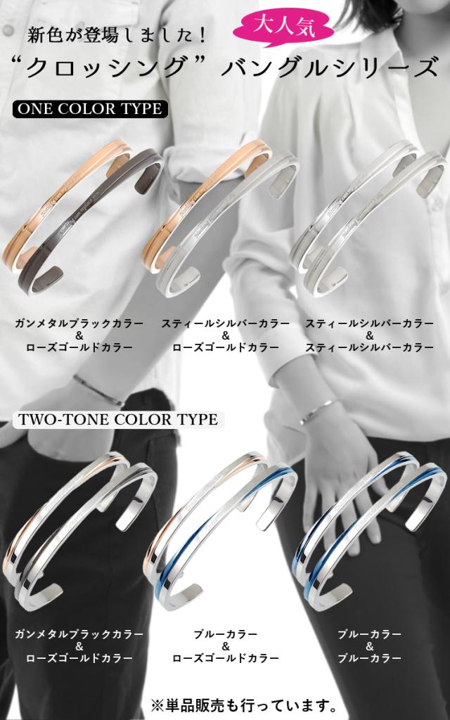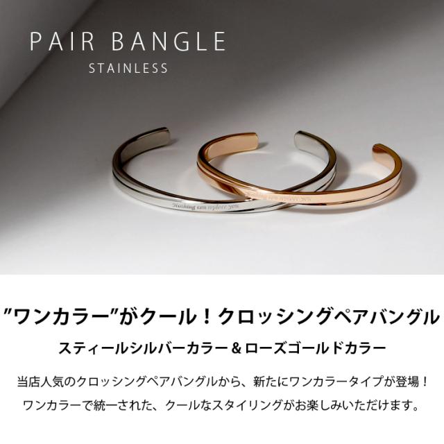 当店人気のクロッシングペアバングルから、新たにワンカラータイプが登場!スティールシルバーカラー&ローズゴールドカラーのクロッシングペアバングル。素材にはサージカルステンレス316Lを使用しているので、金属アレルギーの方にも安心してお使いいただけます。ネーム刻印無料で承ります。
