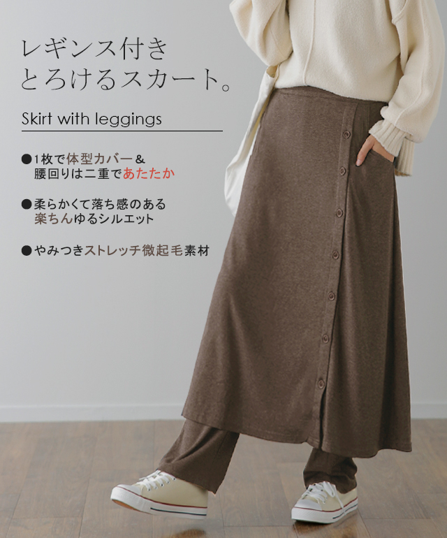 いつものトップスも新鮮に見せてくれるレギンス付きスカート。