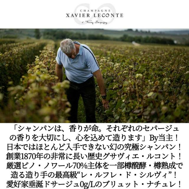 「シャンパンは、香りが命。それぞれのセパージュの香りを大切にし、心を込めて造ります」By当主!日本ではほとんど入手できない幻の究極シャンパン!創業1870年の非常に長い歴史グサヴィエ・ルコント!厳選ピノ・ノワール70%主体を一部樽醗酵・樽熟成で造る造り手の最高級“レ・ルフレ・ド・シルヴィ”!愛好家垂涎ドサージュ0g/Lのブリュット・ナチュレ!