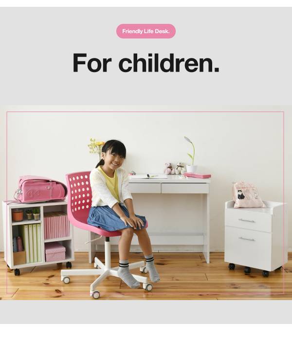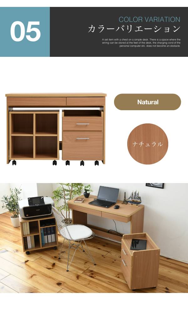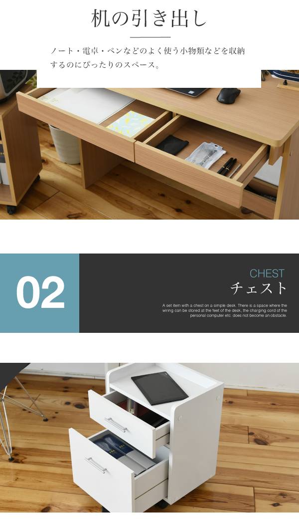 シンプルなデスクにチェストとラックが付いた3点セットアイテム。