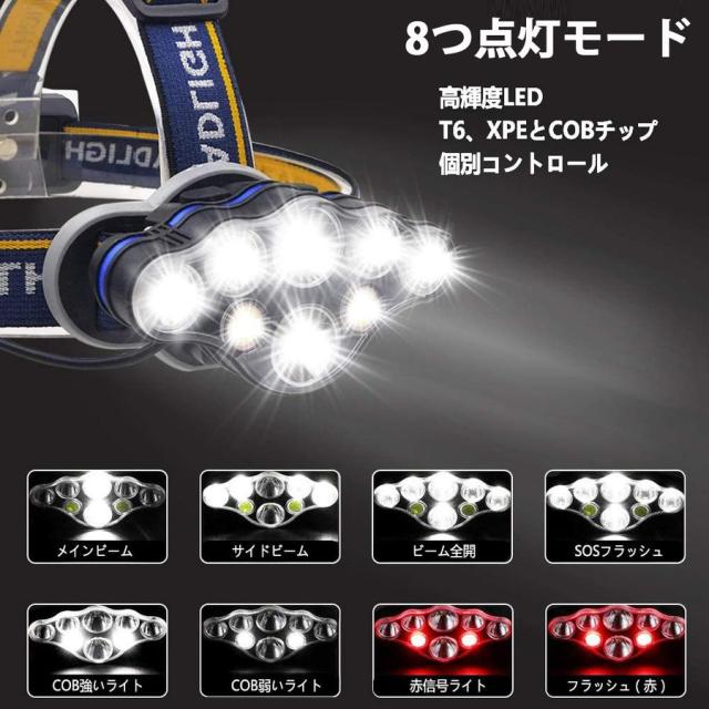 【高輝度LED・8つ点灯モード】LEDヘッドライトがT6、XPEとCOBチップを採用します。18000ルーメンの明るさがあり、照射距離は400-500メートルに達することができます。ベッドライトは8モードがあります