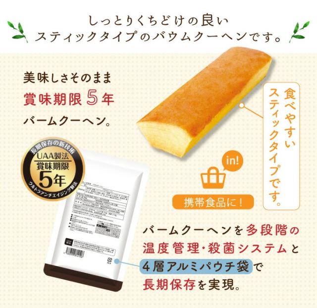・バームクーヘンを多段階の温度管理・殺菌システムと4層アルミパウチ袋で長期保存を実現。食べやすいスティックタイプです。