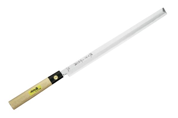 江戸の板前頭が、その昔、座ったまま刺身を切るのに使ったといわれ、現在も関東で多く使われている蛸引包丁です。刺身包丁(柳刃包丁)と同じで刺身を引く際に使います。刺身包丁とは異なる切っ先が四角い長方形になっているのが特徴です。