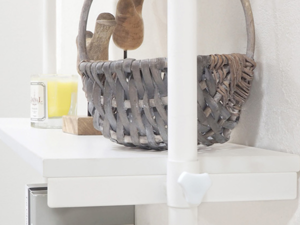 ホワイト×ホワイトの棚板は、水や汚れに強いメラミンシートが貼ってあります。明るく清潔感があり、水回りの設置にもおすすめです。