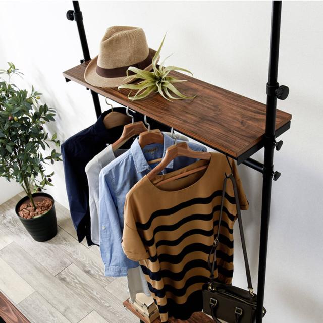 お部屋の好きな場所にコンパクトに設置ができる突っ張りハンガーラックです。2段の棚とハンガーバーはお好みの位置に設置できるので、収納したい小物やラックに掛けたい洋服に合わせて無駄なく収納することができます。