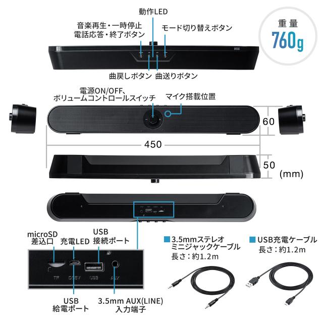 サウンドバー 20W出力 Bluetooth 3.5mmプラグ接続 バッテリー内蔵[400-SP092]