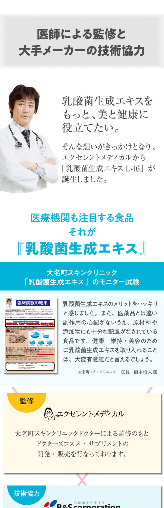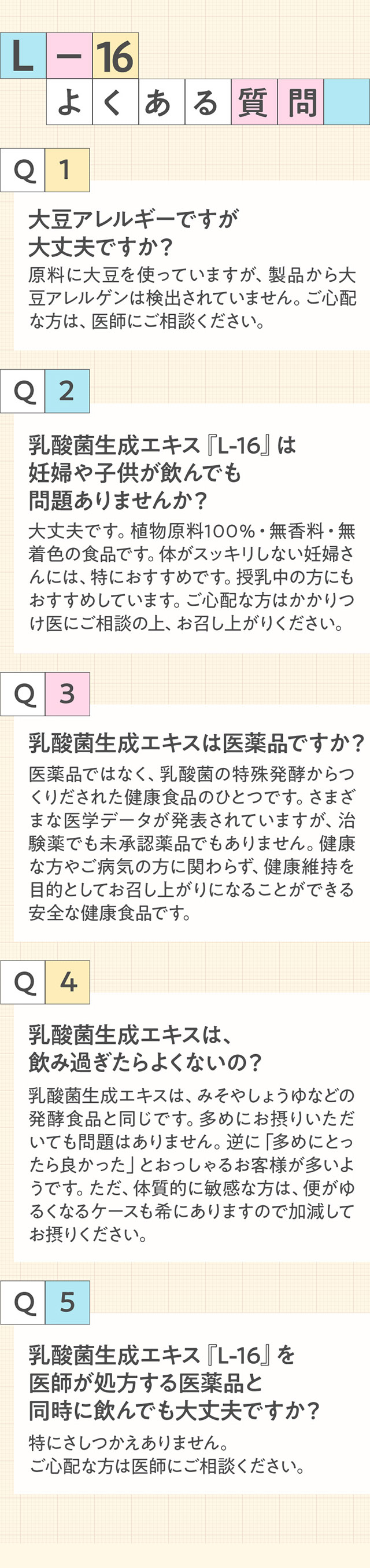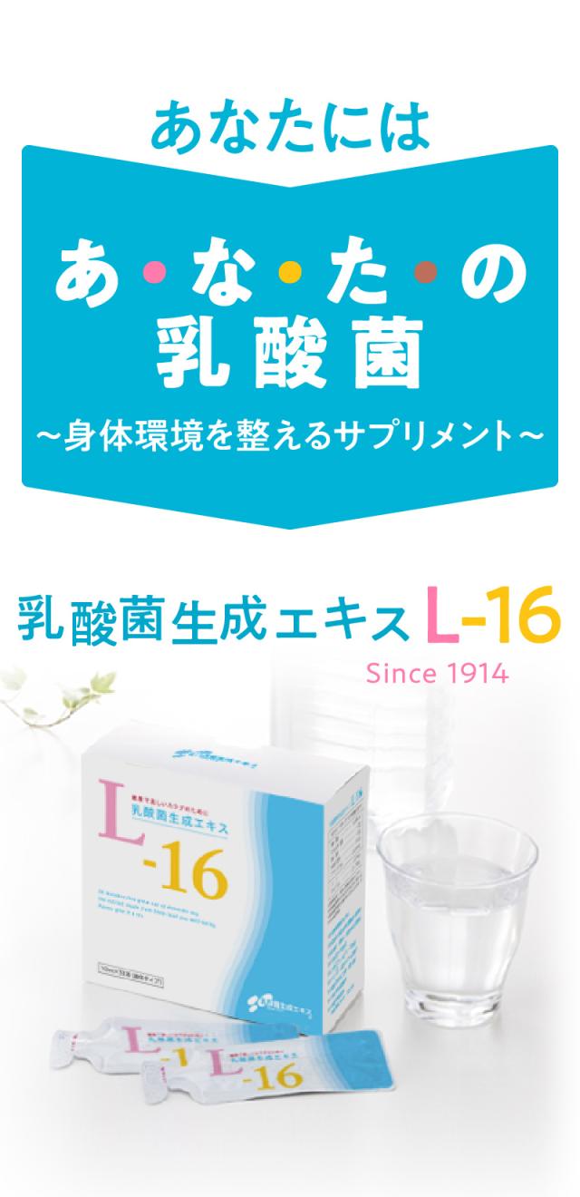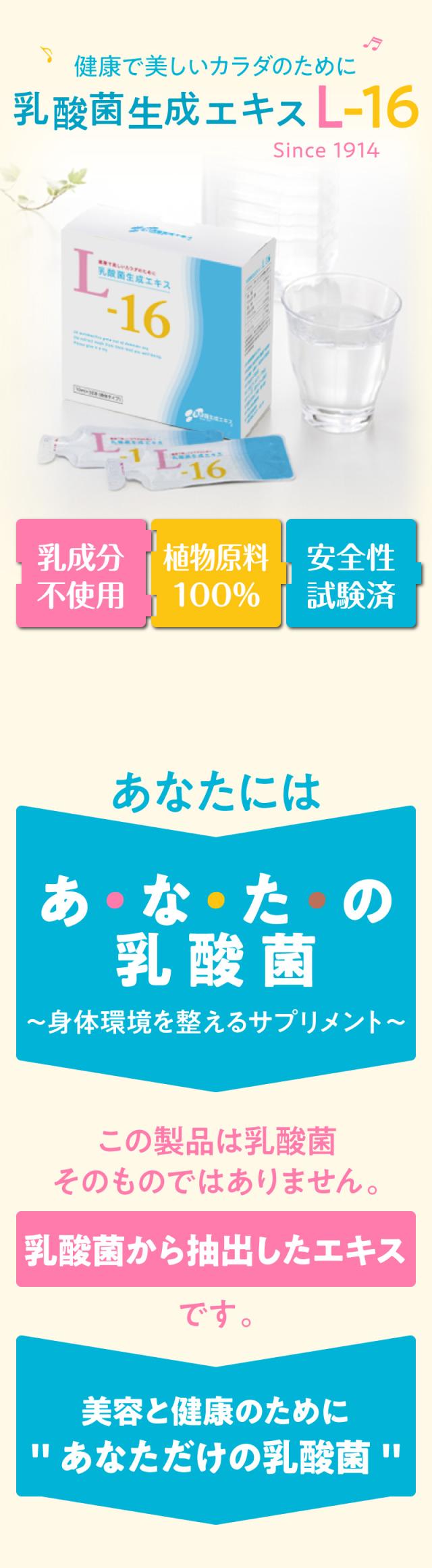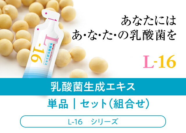 | 商品名 | ▼乳酸菌生成エキスL-16 ●配合成分につきましては、上記の商品名をタップしてご確認ください。 |