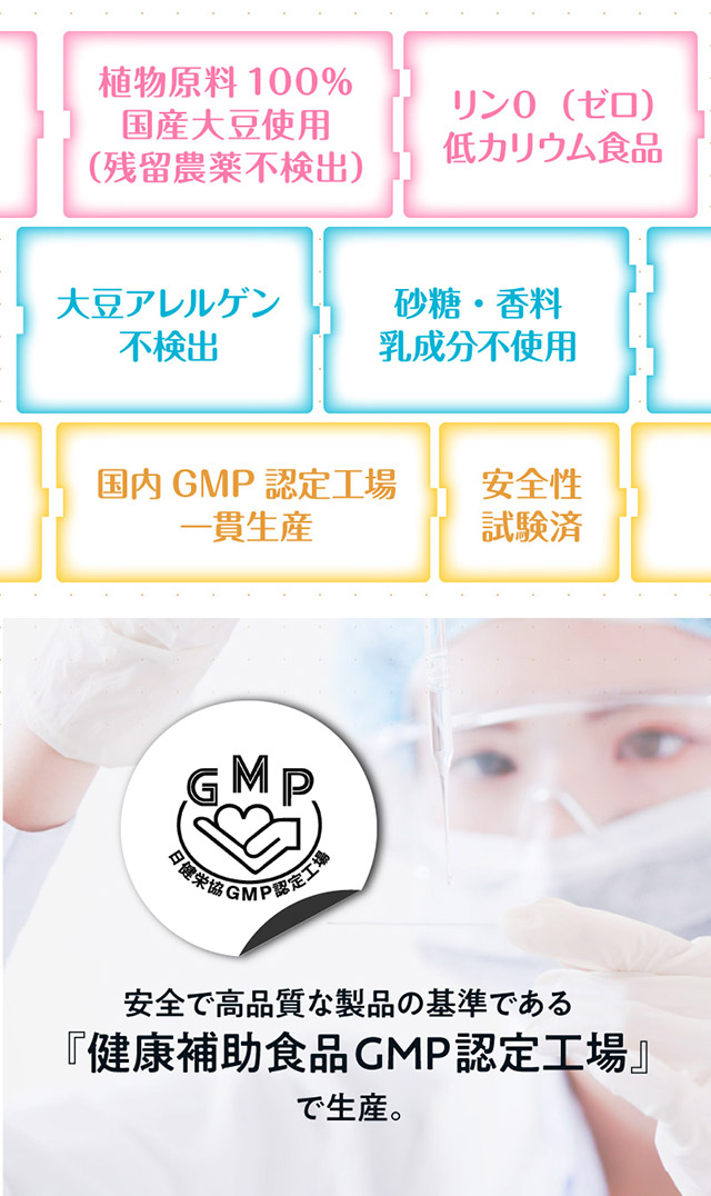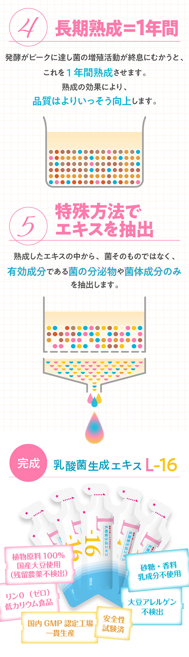 | 特徴 | L-16は、毎日スッキリしない、健康・美容を気にする方におすすめの身体環境を整え、体をケアするサプリメントです。 農薬不使用の国産大豆を使用し、 植物原料100%で無香料・無着色、乳成分不使用の乳酸菌生成エキスです。 |