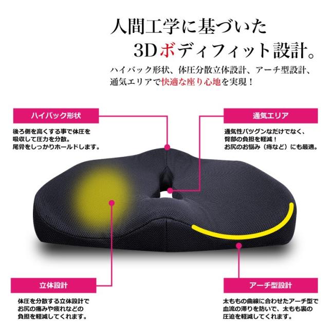 尾骨をしっかりホールドするハイバック形状、体圧を分散する立体設計、太ももの曲線に合わせたアーチ型設計、通気性バツグンの通気エリア