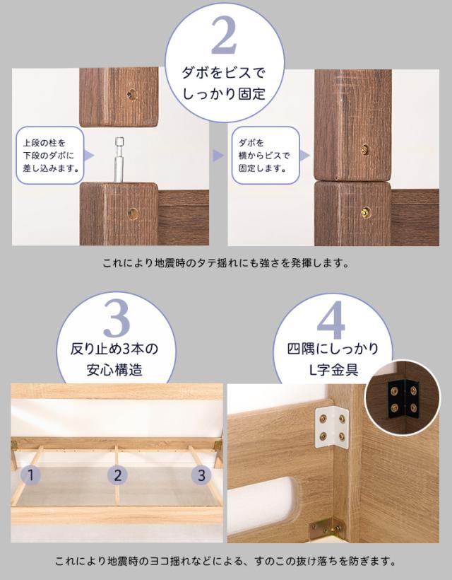 通気性のあるすのこ床を使用しており、すのこ下の反り止めを3本使用した安心構造。耐荷重は約300kgの頑丈設計です。