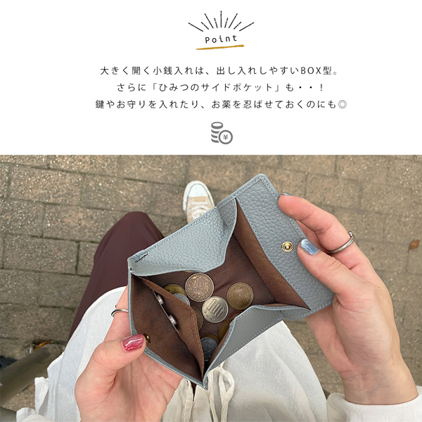 大きく開く小銭入れは、出し入れしやすいBOX型。