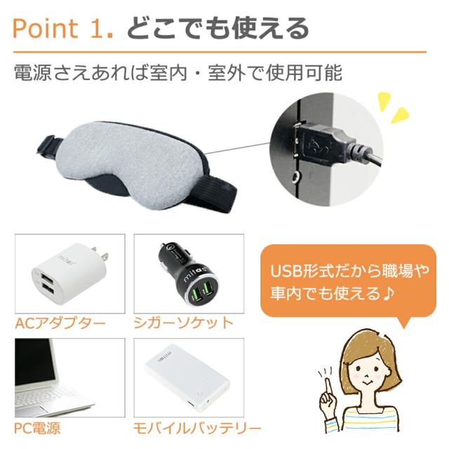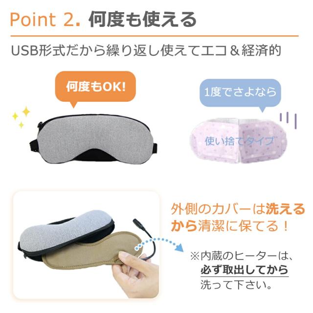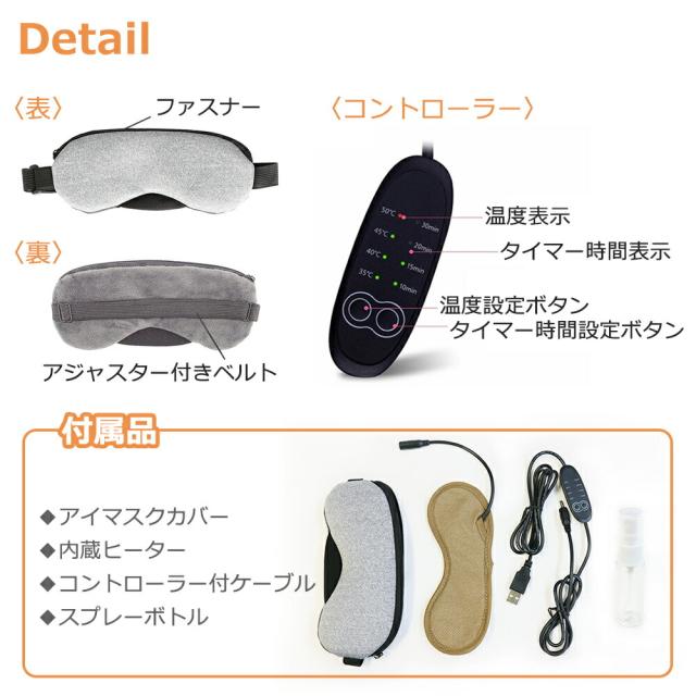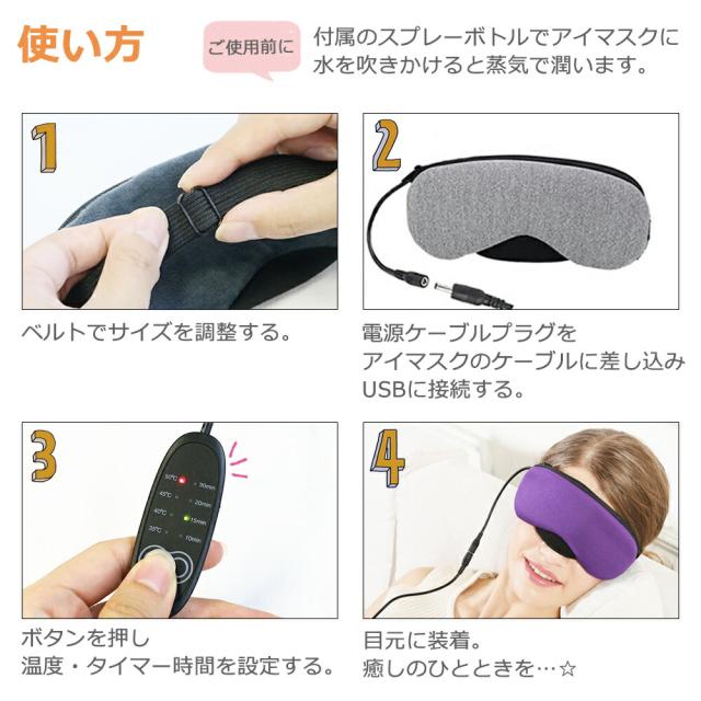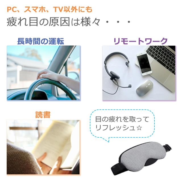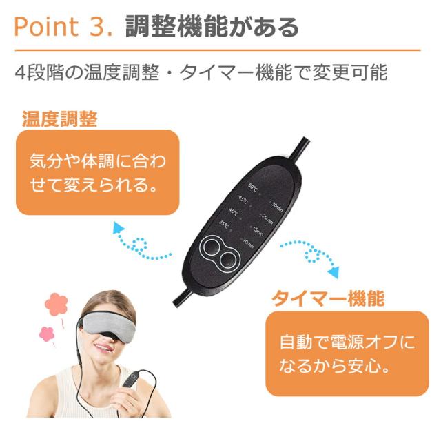 アイマスク/ホット/ホットアイマスク/目元/目元ケア/ケア/あったか/疲労/疲労回復/回復/温度/温度調節/タイマー/タイマー設定/ドライアイ/眼精疲労/疲れ/目が乾く/重い/ぼやける/ヒーター/アイヒーター/USB/USB式/電熱/電熱式/4段階温度調節/睡眠/繰り返し/経済的/エコ/お財布に優しい/健康/健康グッズ/ギフト/プレゼント/蒸気