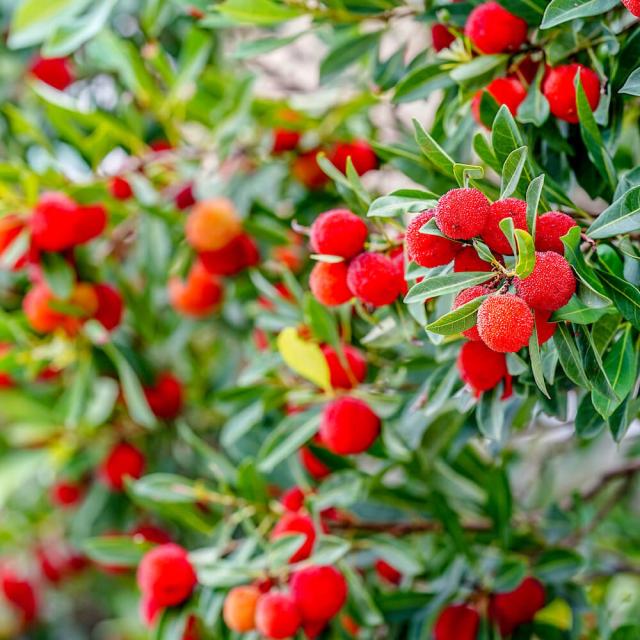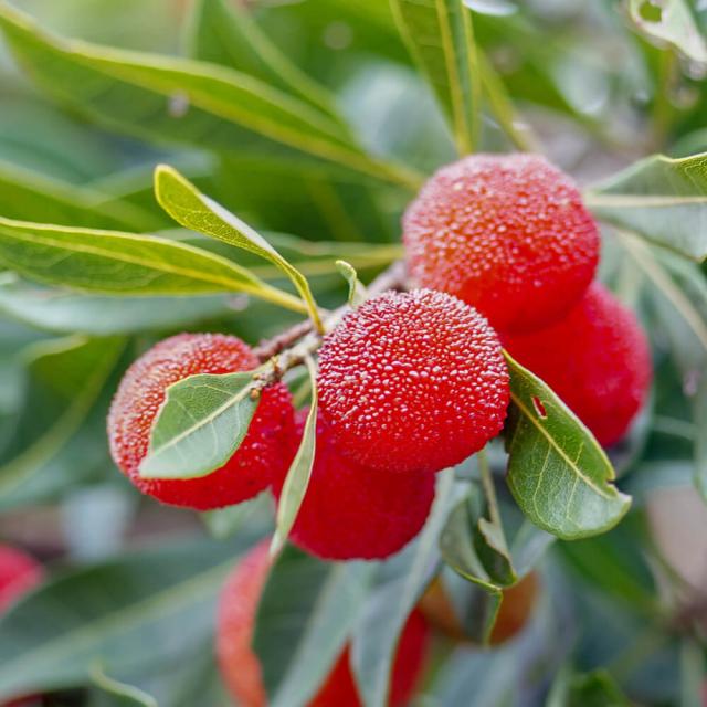 美しい赤い実をたくさんつけます。常緑果樹で、真っ赤な実をぶら下げた姿が愛らしく、お庭のシンボルツリーにもおすすめです。