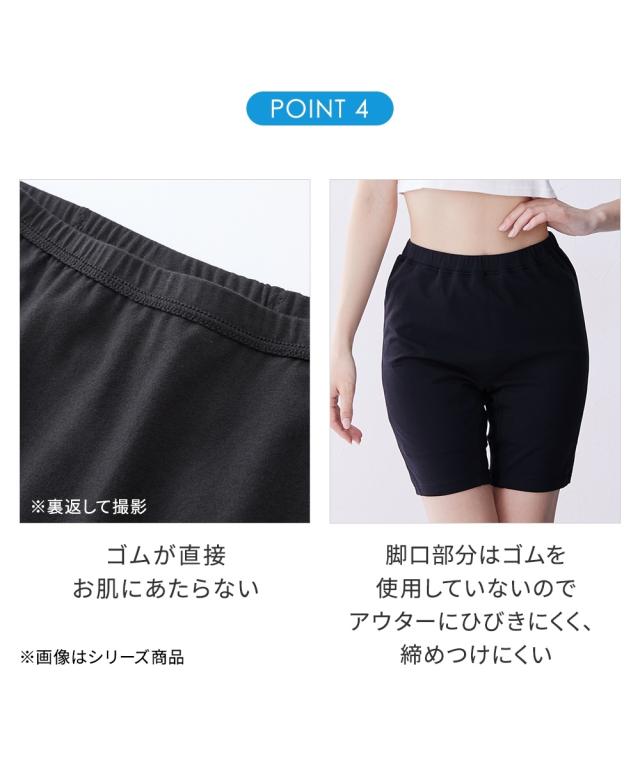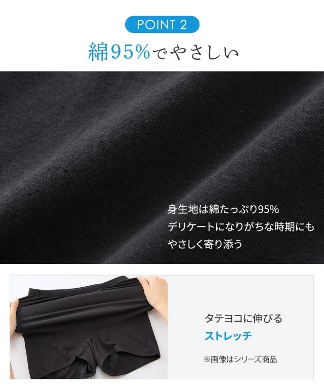 ブルーな日に絶対モレを防ぎたいならこのオーバーパンツ!裏全面防水布だから、ショーツの上に重ねばきすることで、お仕事時も夜も心強い。ウエストはゴムが直接肌にあたらない仕様。身生地は肌ざわりのいい綿混ストレッチではき心地も抜群。