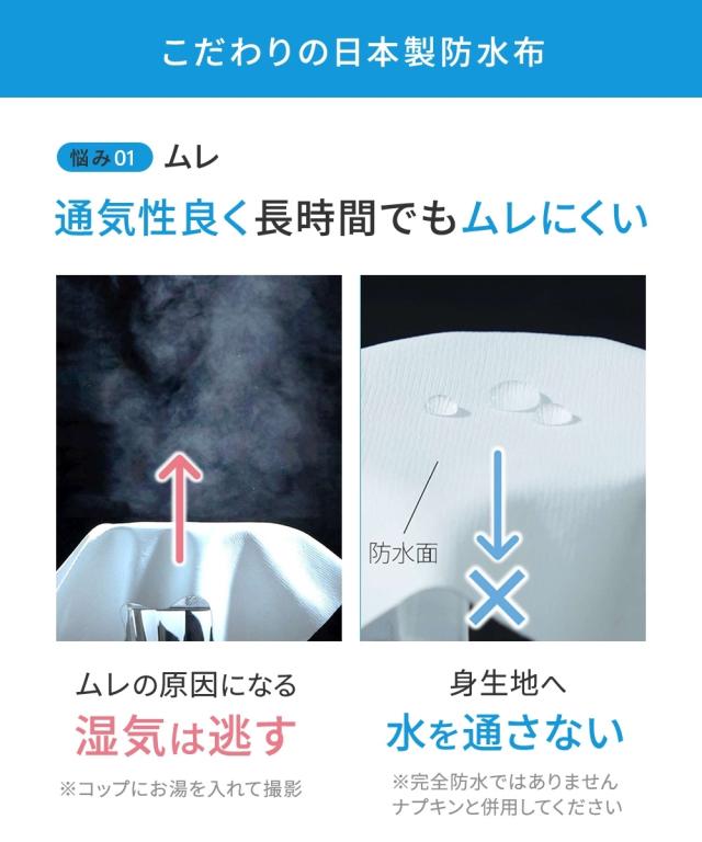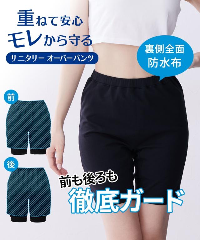 ブルーな日に絶対モレを防ぎたいならこのオーバーパンツ!裏全面防水布だから、ショーツの上に重ねばきすることで、お仕事時も夜も心強い。ウエストはゴムが直接肌にあたらない仕様。身生地は肌ざわりのいい綿混ストレッチではき心地も抜群。