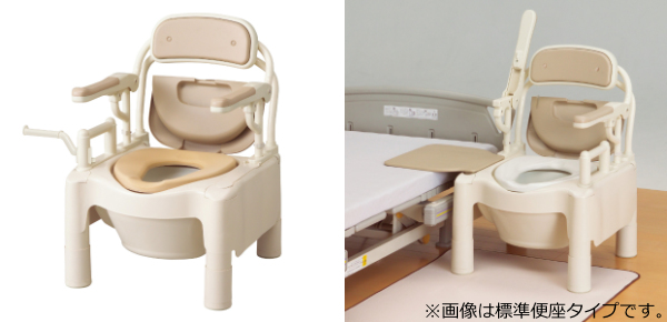●樹脂製ポータブルトイレ”ちびくまくん”シリーズのひじ掛けはね上げタイプです。