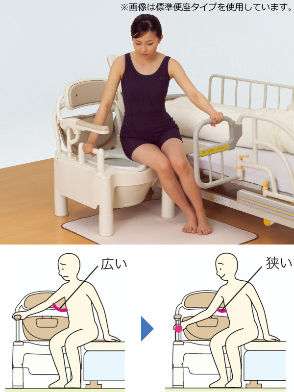 樹脂製ポータブルトイレ”ちびくまくん”シリーズのひじ掛けはねあげ式タイプです。移乗動作がスムーズに行えます。ひじ掛けはね上げタイプの中でも最小クラスの本体幅55cmです。